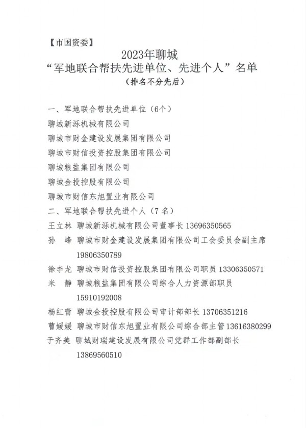 聊城市財金建設(shè)發(fā)展集團(tuán)有限公司被授予“軍地聯(lián)合幫扶先進(jìn)單位”榮譽(yù)稱號,工會副主席孫峰同志被評為“軍地聯(lián)合幫扶先進(jìn)個人”。